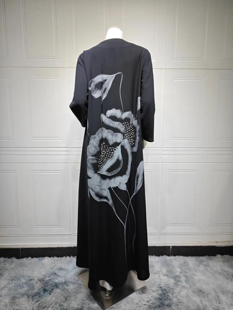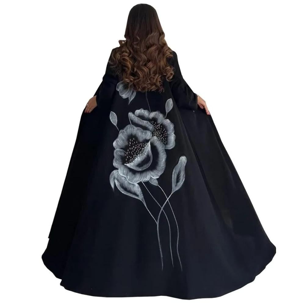 تألقي مع عباية سوداء مفتوحة بفضل تصميمها العصري والمفتوح الذي يتيح لكِ حرية الحركة والزخرفة الموجودة في الجزء الخلفي التي تضيف لمسة من التميز والجمال.