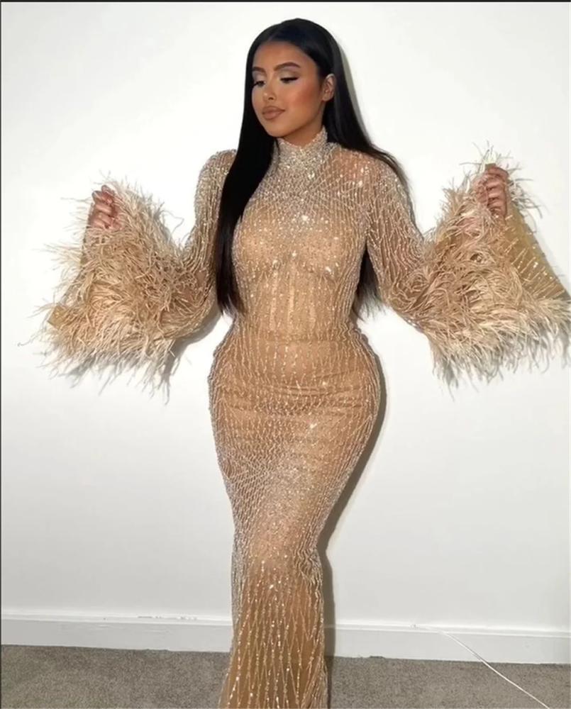 فستان بقصة ضيّقة تبرز جمال القوام من قماش شفاف بتطريزات لامعة بأكمام واسعة من الريش الناعم