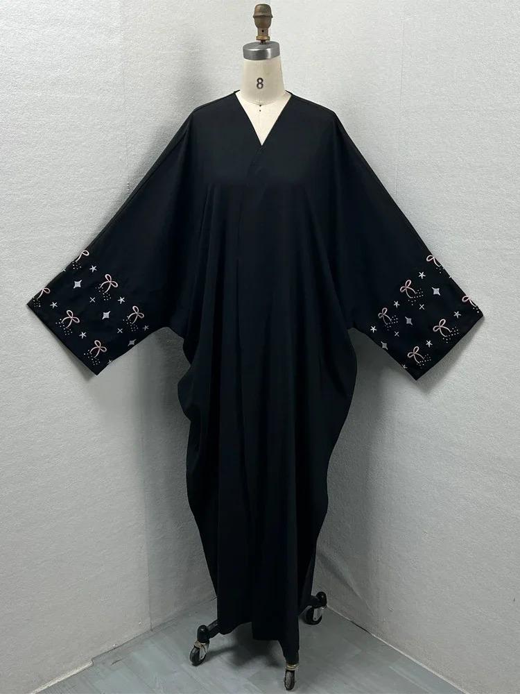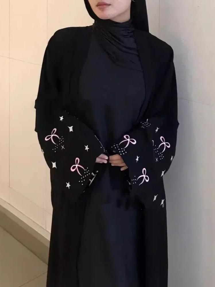 العباية السوداء الأنيقة التي تتميز بتصميم عصري بأكمام مزينة بتطريز ناعم من قماش مريح وقصه انسيابيه