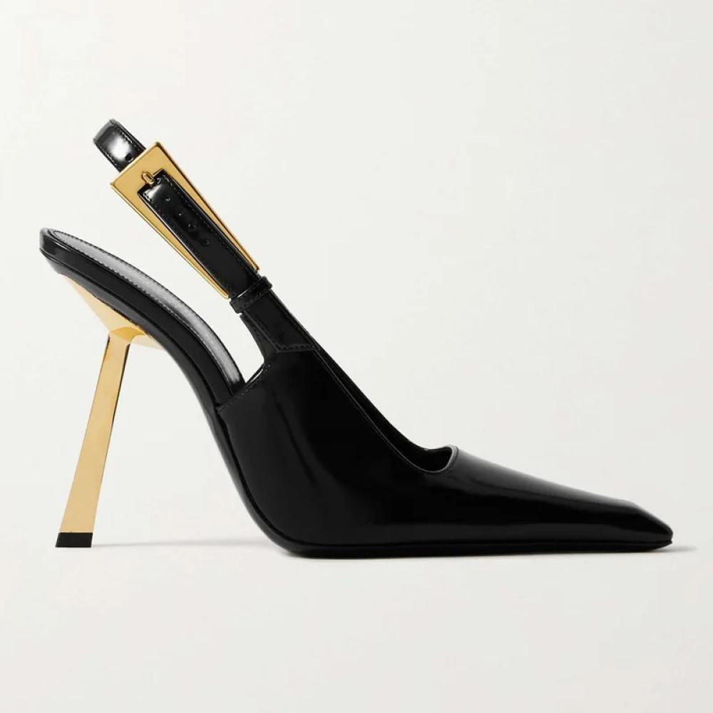 حذاء بكعب عالي من خامة لامعة كعب معدني بلون ذهبي تصميم مفتوح من الخلف