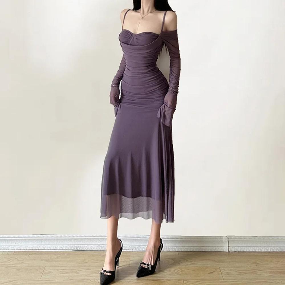 فستان بقصة ضيقة تبرز جمال القوام مكشوف الأكتاف وأكمام طويلة من الشيفون قماش شفاف بطبقة داخلية مريحة