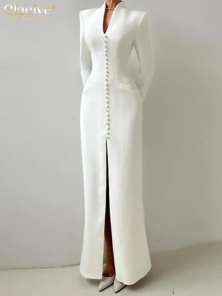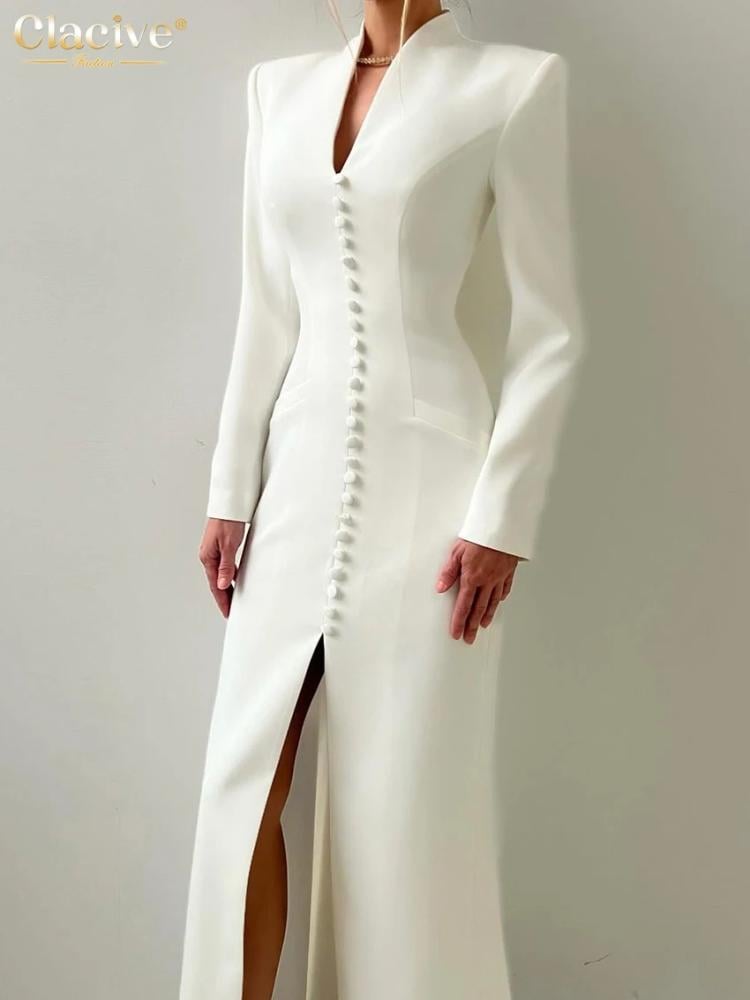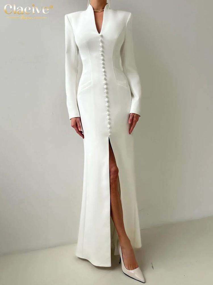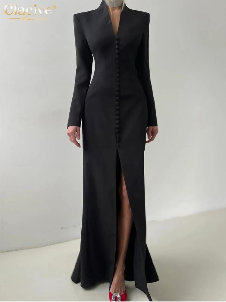 فستان سهرة طويل بأزرار أمامية ياقة V جذابة أكتاف مدعمة شق أمامي أنيق خامة فاخرة
