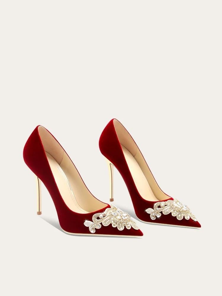 حذاء من مخمل فاخر كعب رفيع ذهبي مقدمة مدببة مزين بتطريزات ذهبية مرصعة بأحجار براقة