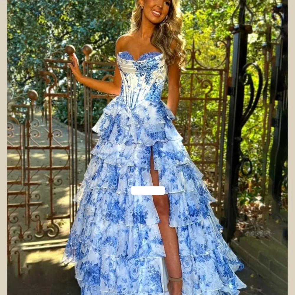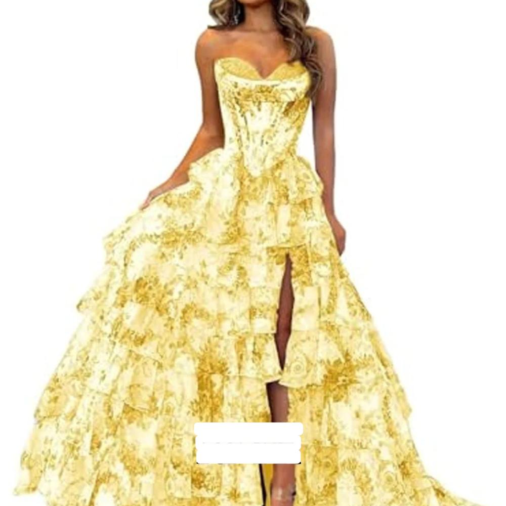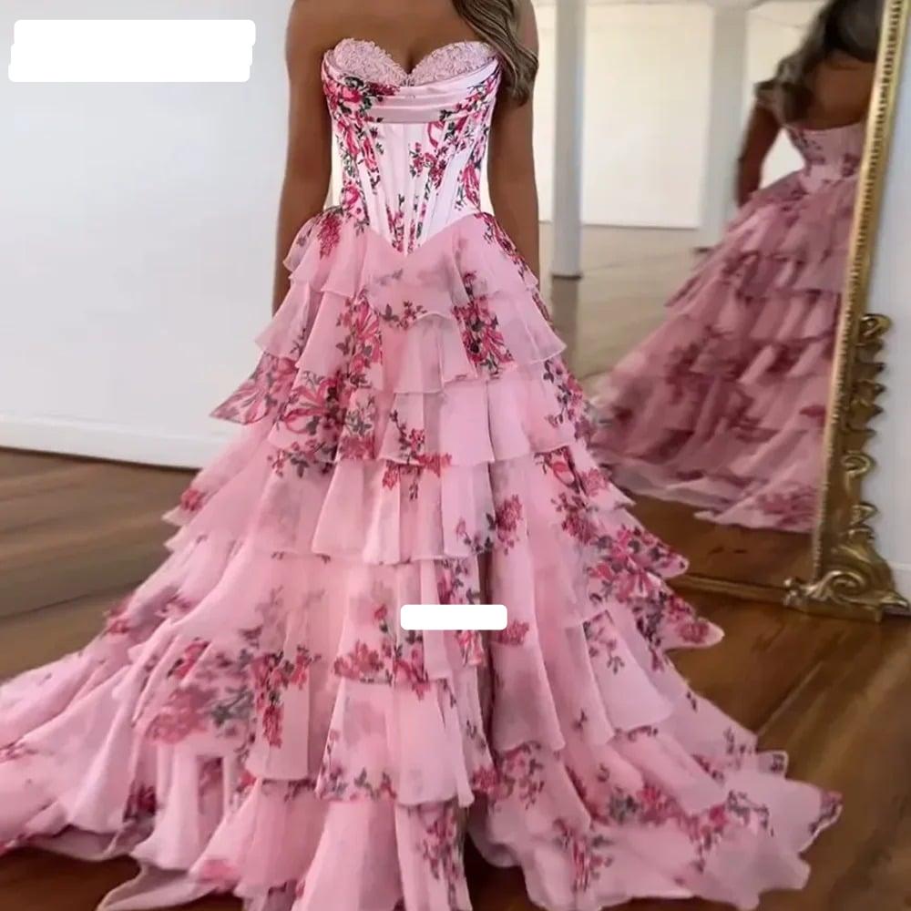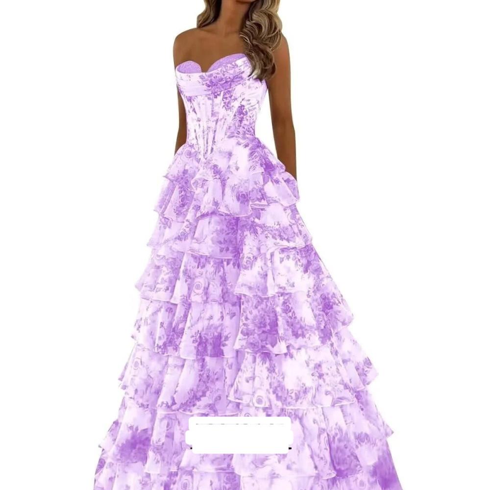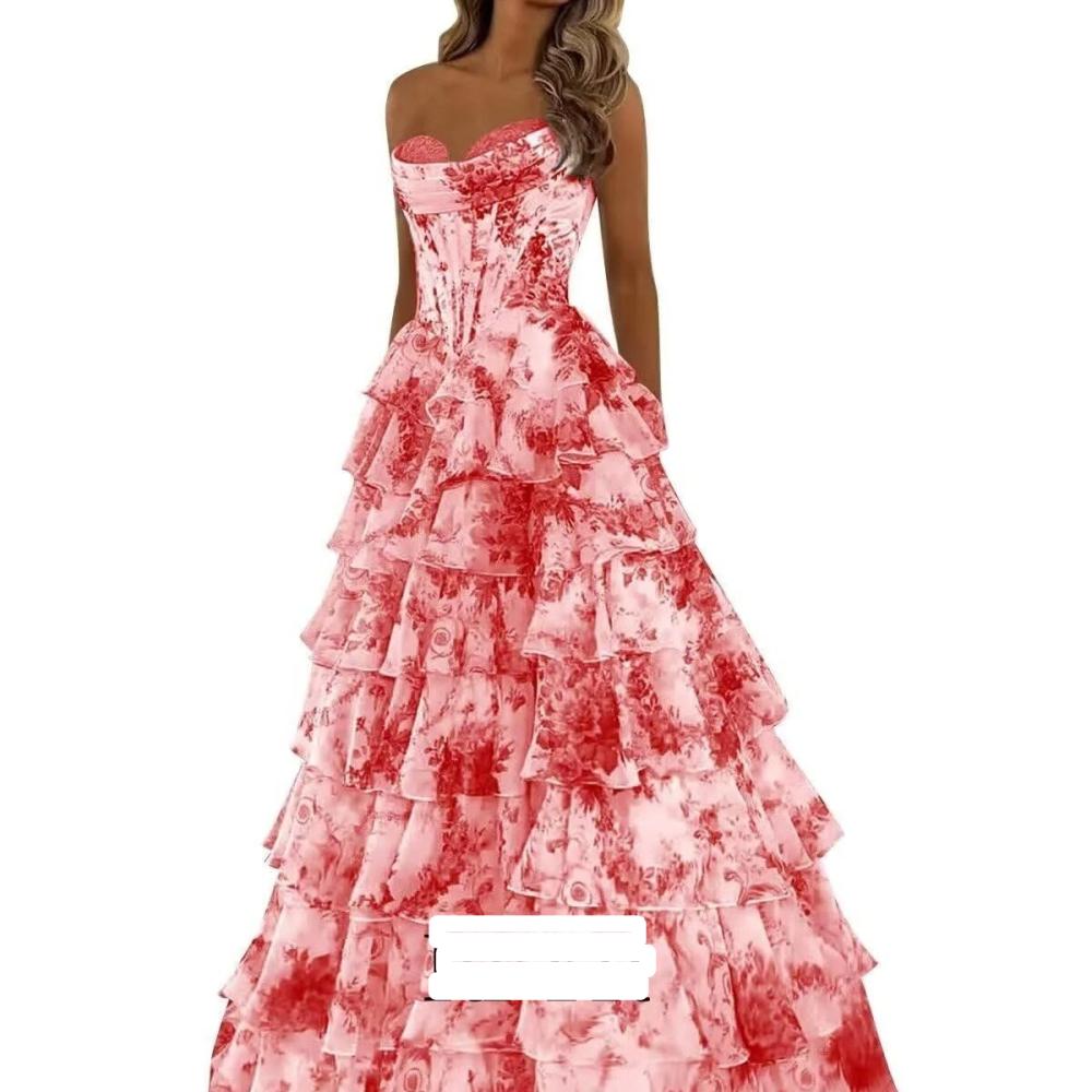 فستان سهرة كورسيه بدون حمالات بطبقات كشكش متعددة مزخرف بنقش زهور
