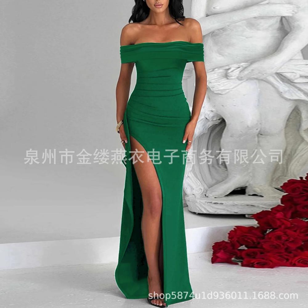 فستان بقصة مكشوفة الأكتاف بتصميم ضيق يبرز القوام الأنثوي بشق أمامي عالٍ يُظهر الساق خامة مرنة وانسيابية أنيقه