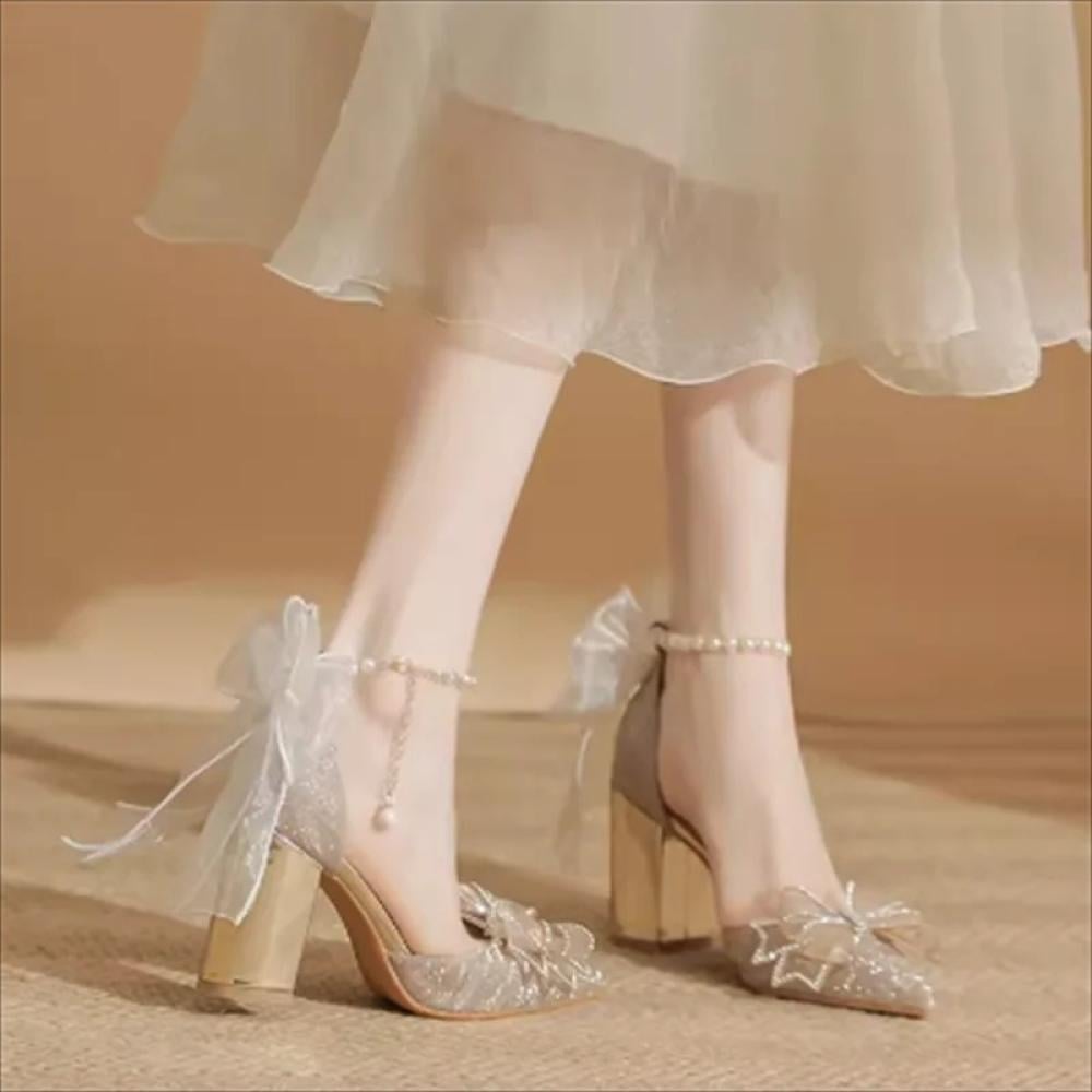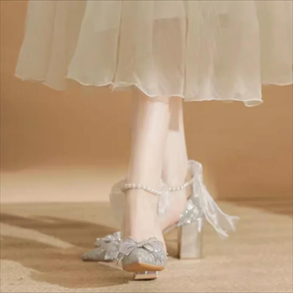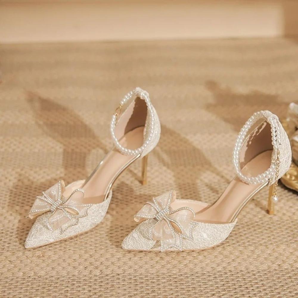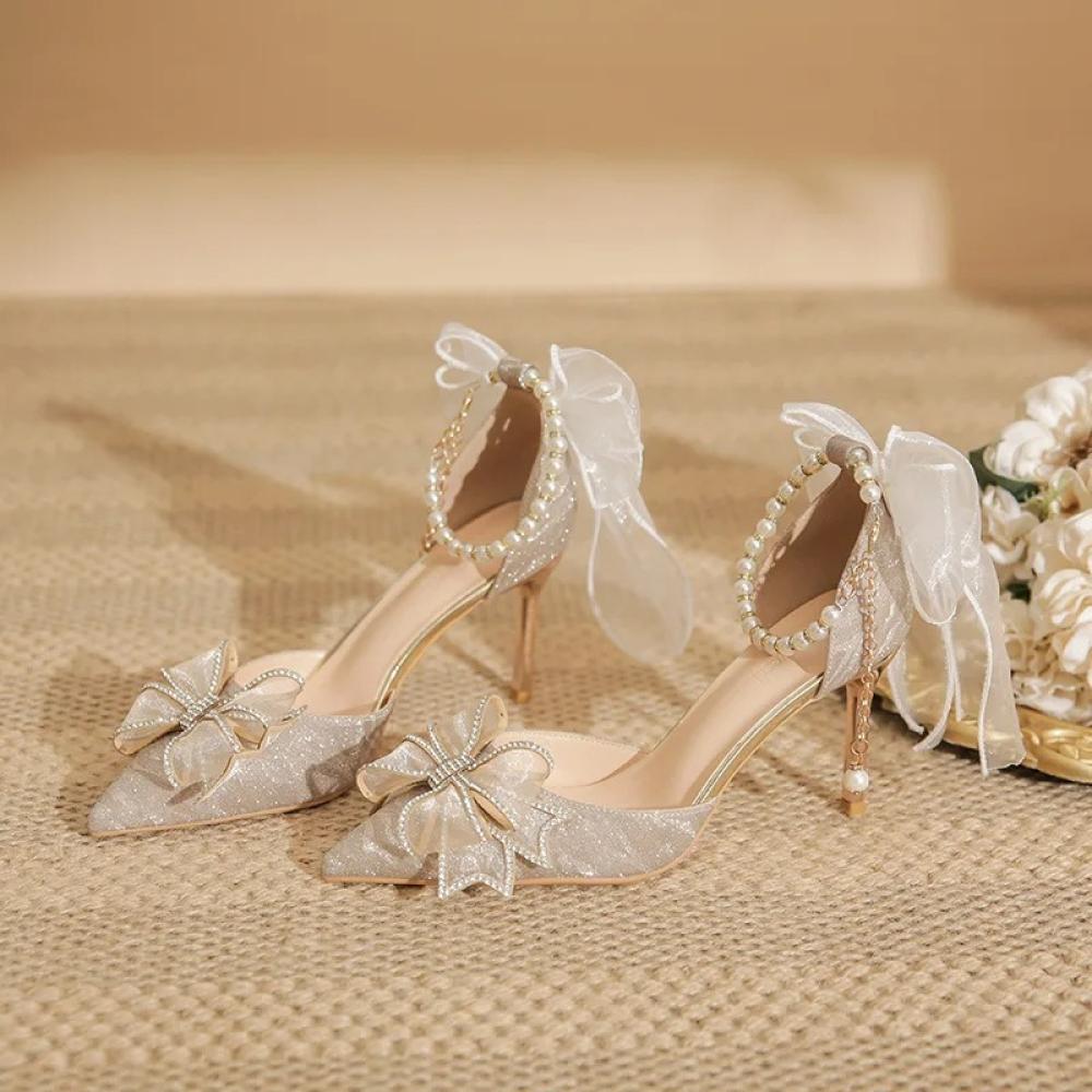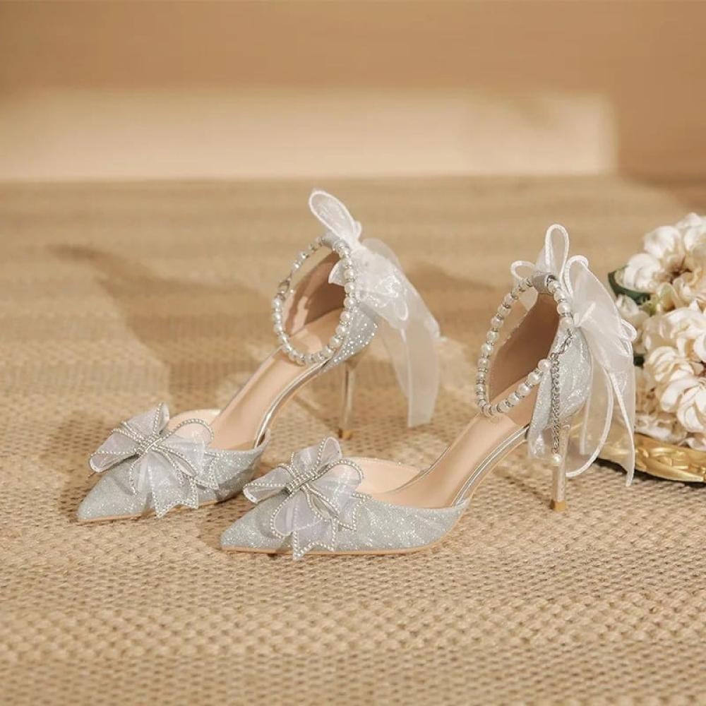 حذاء كلاسيكي كعب عالي لامع راقي مقدمة مدببة مزين بربطة ولؤلؤ