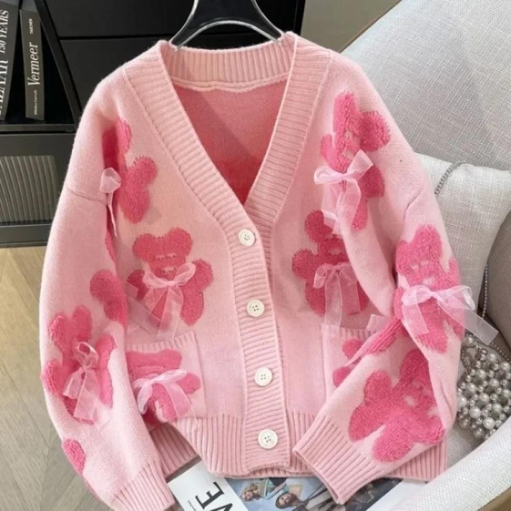 الكنزة الصوفية الأوفرسايز دمى الدب الناعمة بارزة من الصوف مع فيونكات رقيقة